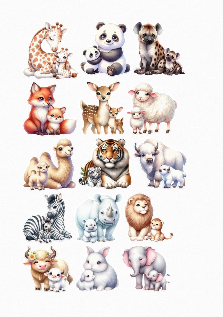 Cette planche de stickers est un véritable hymne à la famille. J’ai dessiné chaque duo avec des traits ronds et des regards expressifs pour capturer ces moments de complicité unique. On y retrouve une grande variété d’animaux du monde entier : renards, tigres, zèbres, et même un petit bison et une hyène toute mignonne !