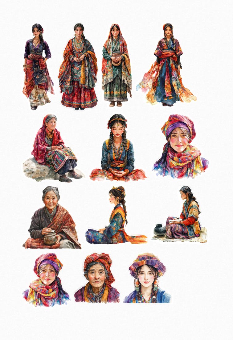 Cette planche de stickers est une invitation au respect et à l’admiration des cultures du monde. J’ai voulu rendre hommage à la richesse des traditions à travers des portraits de femmes de tous âges, vêtues de leurs plus beaux atours traditionnels. On y retrouve des drapés aux motifs complexes, des bijoux artisanaux et des coiffes fleuries, le tout traité avec la douceur et la transparence de l’aquarelle.