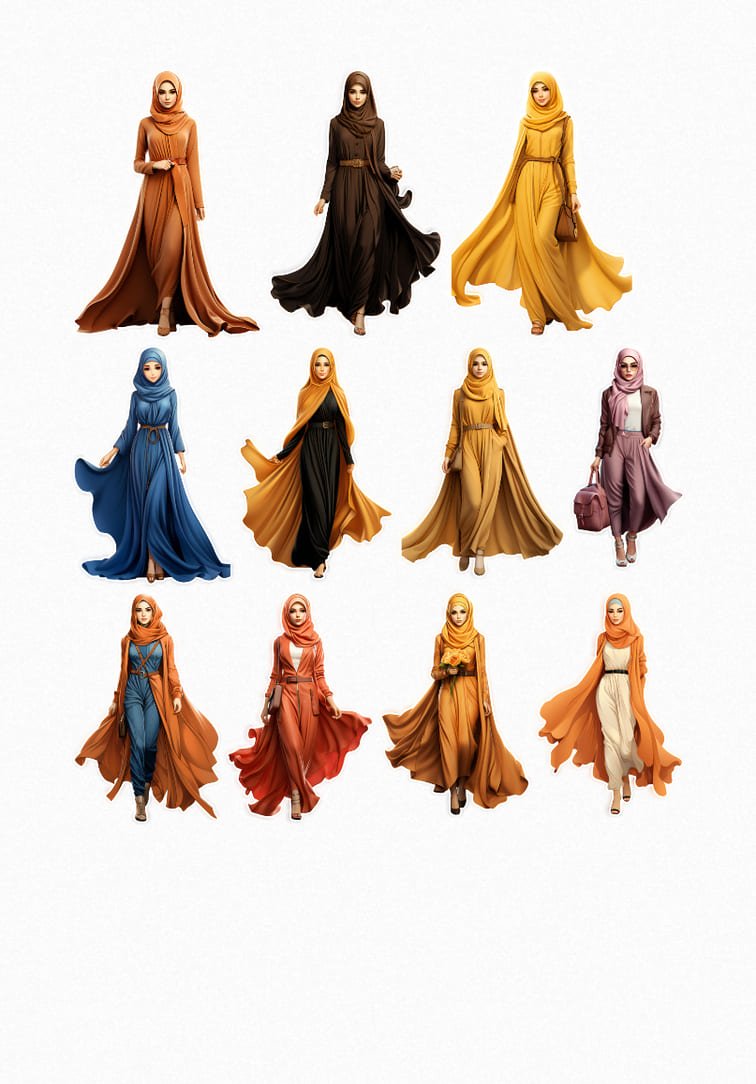 Cette planche met en avant des silhouettes féminines d’une grande finesse, portant des tenues contemporaines aux coupes impeccables. J’ai choisi une palette de couleurs riches — ocre, terre de Sienne, bleu profond et chocolat — pour souligner le mouvement des tissus et la grâce des postures. Chaque sticker est une ode à la confiance en soi et au style moderne.