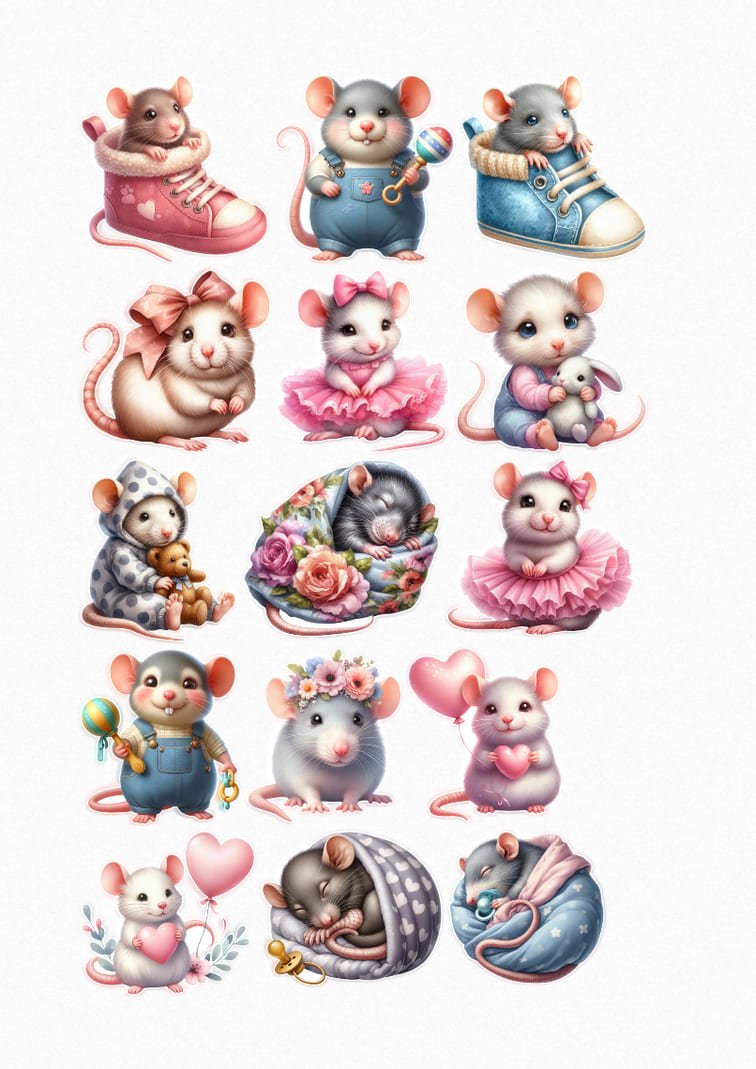 Cette planche est une ode à l’enfance et à la douceur. J’ai imaginé tout un univers miniature où ces petits rongeurs deviennent de véritables héros de contes de fées : une petite souris qui dort dans une basket rose, une autre portant une couronne de fleurs, ou encore un duo de danseuses en tutu rose. Chaque sticker capture une émotion, du rire aux rêves les plus doux.