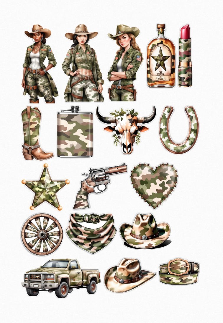 Chaque sticker est une illustration détaillée, capturant l’essence d’un style unique et indépendant. Vous y découvrirez des personnages féminins au look affirmé, vêtues de tenues de camouflage à la fois pratiques et tendance, incarnant la force et la liberté. Ces figures sont accompagnées d’icônes classiques du Far West, comme des chapeaux de cowboy authentiques et une botte stylisée, évoquant les vastes paysages et l’esprit des pionniers.